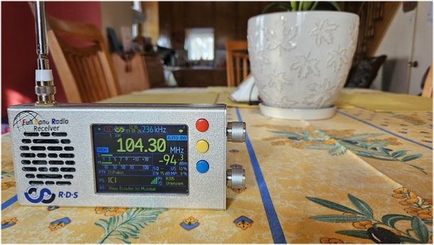 My last acquisition (2025) is this tiny portable “TEF6686”, which I mainly use for FMDX. The name TEF6686 is for the chip that runs the radio. The RDS decode on that receiver is very fast and it has good sensitivity. It is widely use in car radios and DIY projects. For instance, the above model comes from Ali Express. As for the firmware, it has been “cracked” in order to be able to scan the band and send the RDS data batch to the RabbitEars server. I have it connected to my dipole 24/7 (shown here with the provided whip antenna). See here my location’s freshly collected data.
